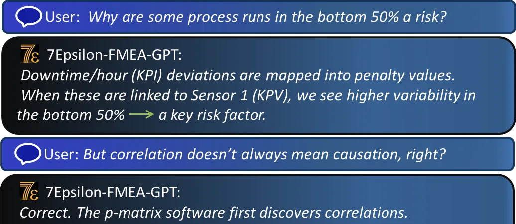 7Epsilon-FMEA-GPT translates penalty insights into root-cause reasoning with scientific rationales.